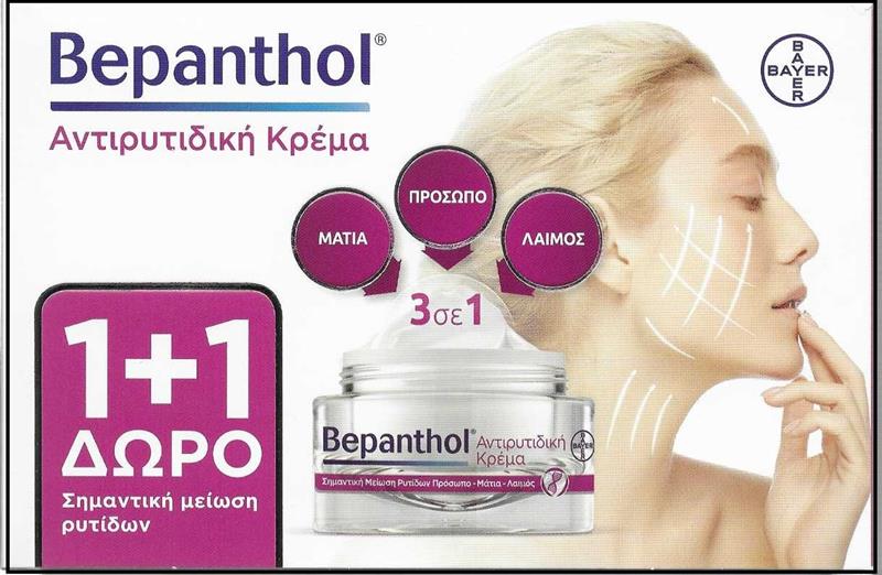 Η νέα αντιρυτιδική κρέμα προσώπου - ματιών - λαιμού Bepanthol κλινικά αποδεδειγμένα μειώνει σημαντικά το συνολικό αριθμό των ρυτίδων και βελτιώνει τη σφριγηλότητα του δέρματος. Παράλληλα, ενυδατώνει, θρέφει και δίνει λάμψη στο δέρμα.