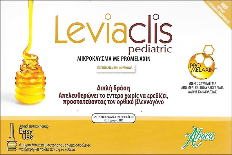 Το Leviaclis Pediatril συνδυάζει μια ισορροπημένη υπακτική δράση με την προστασία και την ανακούφιση του ορθικού βλεννογόνου. Η διπλή δράση του Leviaclis οφείλεται στο PROMELAXIN, ένα ενεργό σύμπλεγμα μελιών από νέκταρ και από μελιτώματα, η προσεκτική επιλογή και επεξεργασία των οποίων γίνεται βάσει της περιεκτικότητά τους σε μονοσακχαρίδια, πολυσακχαρίδια και μελανοϊδίνες, και το οποίο εμπλουτίζεται από πολυσακχαριδικό κλάσμα αλόης και μολόχας. Το Leviaclis Pediatril ασκεί υπακτική δράση που δεν ερεθίζει και προάγει τη φυσιολογική και ισορροπημένη ενεργοποίηση της αφόδευσης. Επίσης, το Leviaclis Pediatril, χάρη στις βλεννο-προσομοιάζουσες ιδιότητές του και το ιξώδες του, προστατεύει τον ορθικό βλεννογόνο κατά τη διέλευση των κοπράνων, προσομοιώνοντας τη λιπαντική δράση της φυσιολογικής βλέννης. Αυτές οι ειδικές ιδιότητες, μαζί με την αντιοξειδωτική δράση, προσδίδουν στο προϊόν την ικανότητα να προστατεύει και να απαλύνει το βλεννογόνο ασκώντας έμμεσο αντιφλεγμονώδη ρόλο που οφείλεται στα φυσικά χαρακτηριστικά του προϊόντος.