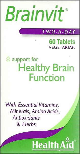 Το Brainvit της HealthAid είναι μοναδική φόρμουλα που υποστηρίζει δυναμικά και τους 4 άξονες των εγκεφαλικών λειτουργιών (Μνήμη-Συγκέντρωση-Σκέψη-Διαύγεια). Κατάλληλο για ενεργούς ενήλικες και μεσήλικες που χρειάζονται σε καθημερινή βάση πνευματική διαύγεια, αυτοσυγκέντρωση και υποστήριξη. Επίσης για μαθητές και σπουδαστές, πριν και κατά την περίοδο εξετάσεων, που απαιτείται το μέγιστο της απόδοσής τους. Για φυτοφάγους. Περιέχει σόγια και φαινυλαλανίνη