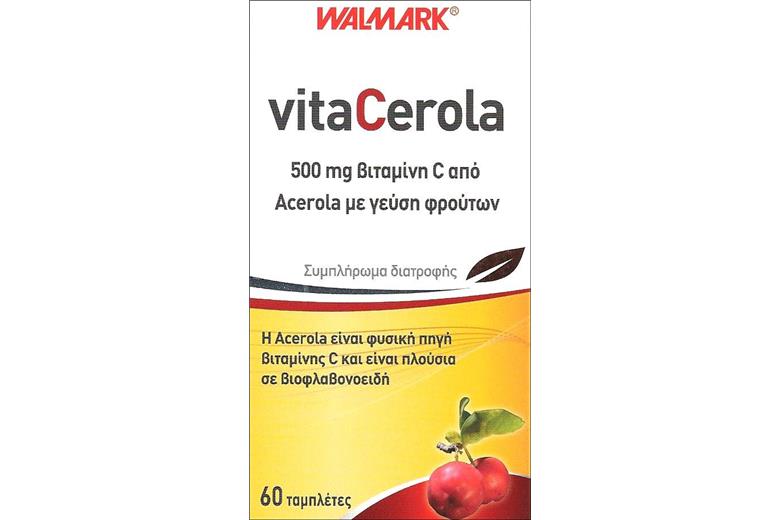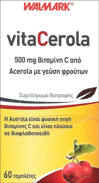 Η Acerola είναι μια μοναδική φυσική πηγή βιταμίνης C, βιοφλαβονοειδών και ρουτίνης (βιταμίνη P). Κάθε ταμπλέτα vitaCerola περιέχει 500mg βιταμίνη C από Acerola (Malpighia Punicifolia), που είναι η πιο πλούσια πηγή βιταμίνης C, και επιπλέον είναι εμπλουρισμένη με ένα ευχάριστο άρωμα φρούτων. Η βιταμίνη C είναι ένα αντιοξειδωτικό που προστατεύει τα κύτταρα του σώματος. Είναι απαραίτητη για τη διατήρηση της υγείας, των οστών, των δοντιών, των συνδέσμων, των ούλων και του δέρματος. η βιταμίνη C βοηθά στη λειτουργία του νευρικού συστήματος και υποστηρίζει το ανοσοποιητικό σύστημα του σώματος. Η βιταμίνη c συνεισφέρει στην απορρόφηση του σιδήρου από τις τροφές. Τα βιοφλαβονοειδή και η ρουτίνη (βιταμίνη P) υποστηρίζουν την υγεία του ανοσοποιητικού συστήματος. Η ρουτίνη βοηθά τη λειτουργία των αγγείων του αίματος (αρτηρίες, φλέβες, τριχοειδή αγγεία) και ομαλοποιεί τη διαπερατότητα, και βοηθά στην υγεία και την ελαστικότητα των τοιχωμάτων των αιμοφόρων αγγείων.