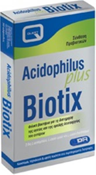 Το Acidophilus Plus Biotix της Quest σχεδιάστηκε για όσους έχουν ανάγκη ρύθμισης της λειτουργίας του εντέρου και του πεπτικού τους. Είναι απαραίτητο για άτομα με γαστρεντερικές διαταραχές, τυμπανισμό ή άτομα που λαμβάνουν αντιβιοτικά. Περιέχει τριών ειδών βακτήρια για τα οποία έχει αποδειχθεί ότι διατηρούν τη σταθερότητά τους μέχρι την ημερομηνία λήξης του προϊόντος και επιβιώνουν κατά τη διέλευση τους από τα υγρά του στομάχου δρώντας κατευθείαν στο έντερο. Το Acidophilus Plus Biotix της Quest εξασφαλίζει μια ιδανική αναλογία “φιλικών” προβιοτικών βακτηρίων στο γαστρεντερικό σωλήνα, η οποία διαταράσσεται από τον τρόπο ζωής και τα ταξίδια. Μειώνει τη δυσκοιλιότητα και τη διάρροια και υποστηρίζει ένα υγιές έντερο και πεπτικό σύστημα. Επίσης, ενισχύει το ανοσοποιητικό σύστημα.