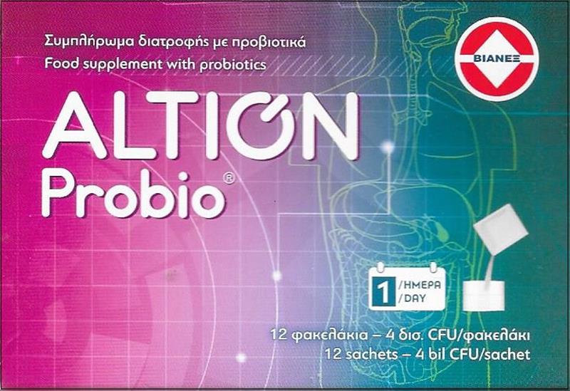 Το ALTION Probio είναι συμπλήρωμα διατροφής που περιέχει προβιοτικά στελέχη (Lactobacillus rhamnosus Rosell-11, Lactovacillus helveticus Rosell-11), τα οποία είναι φιλικοί ζωντανοί μικροοργανισμοί επειδή ωφελούν τον οργανισμό και ειδικά το πεπτικό σύστημα.