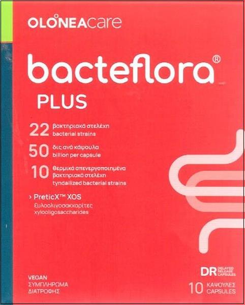 Το Bacteflora Plus είναι συμβιωτικό συμπλήρωμα 10 προβιοτικών στελεχών με 30 δις προβιοτικά βακτήρια ανά κάψουλα και πρεβιοτική ινουλίνη για την καθημερινή συμπλήρωση του εντερικού μικροβιώματος και τη φυσιολογική λειτουργία του εντέρου. Το Bacteflora Plus απευθύνεται σε άτομα με διαταραχές ισορροπίας της εντερικής χλωρίδας, για την καθημερινή συμπλήρωση, προστασία και εξισορρόπηση του εντερικού μικροβιώματος.