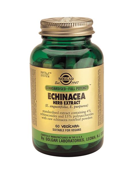 E. angustifolia, E. purpurea Παρουσιάζει αντιβακτηριακές, αντιφλεγμονώδεις και κατά των διηθητών ιών ιδιότητες. Καθαρίζει το αίμα, διεγείρει και ενισχύει το ανοσοποιητικό σύστημα. Χρήσιμο σε περιπτώσεις κρυολογημάτων, γρίπης, μολύνσεων, έρπητα, συνδρόμου χρονίας κόπωσης, αλλεργιών και διαφόρων προβλημάτων του δέρματος. Έχει αναφερθεί ότι σε περιπτώσεις που η Echinacea χρησιμοποιείται μακροχρόνια και σε υψηλές δόσεις, για να ενδυναμώσει το ανοσοποιητικό, μπορεί να καταστεί λιγότερο αποτελεσματική με το χρόνο. Προτείνονται μικρά διαλείμματα ή εναλλαγή του βοτάνου με άλλα παρεμφερή βότανα αν η χρήση του είναι απαραίτητη για μακρό χρονικό διάστημα. Σε φυτοκάψουλες. Προσοχή: Άτομα που πάσχουν από αυτοάνοσες ασθένειες είναι καλό να αποφεύγουν τη χρήση της Echinacea για παρατεταμένο χρονικό διάστημα.